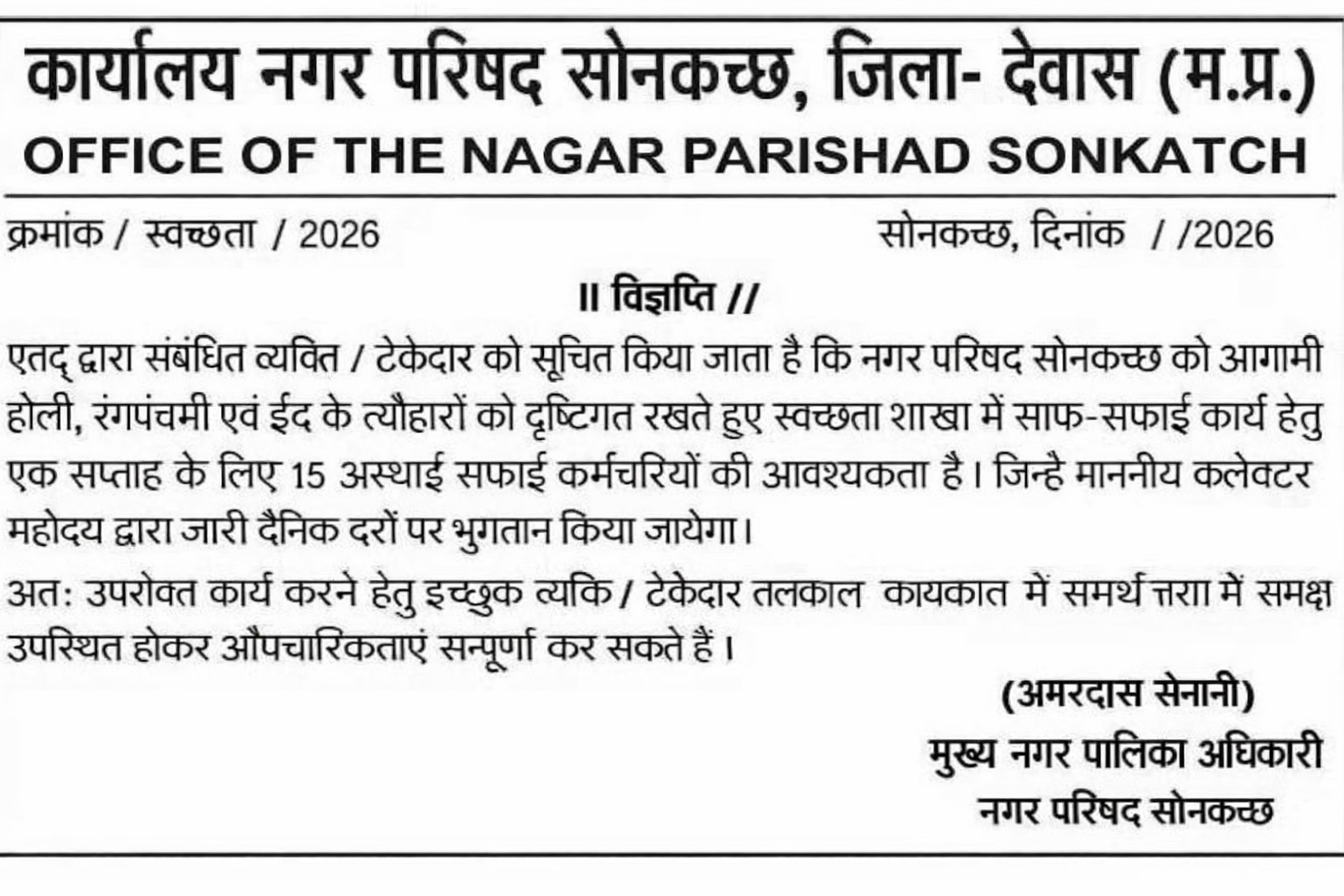 मध्यप्रदेश नगर परिषद भर्ती 2026 : अस्थायी भर्ती Name of Post Total Post भर्ती का स्थान सफाईकर्मी 15 कार्यालय नगर परिषद सोनकच्छ, जिला देवास भर्ती अवधि 1 सप्ताह